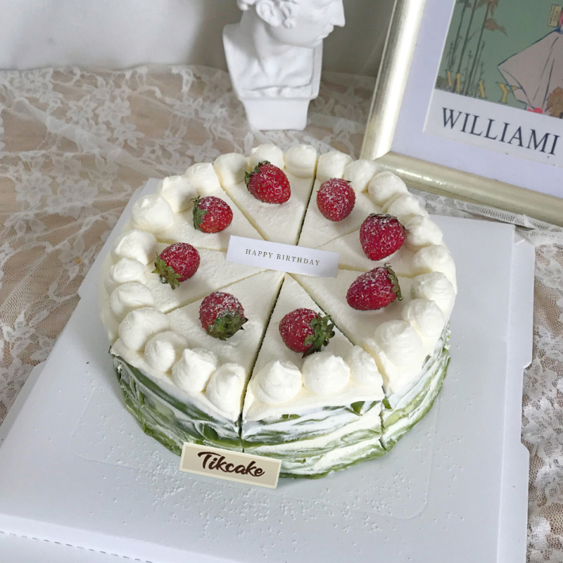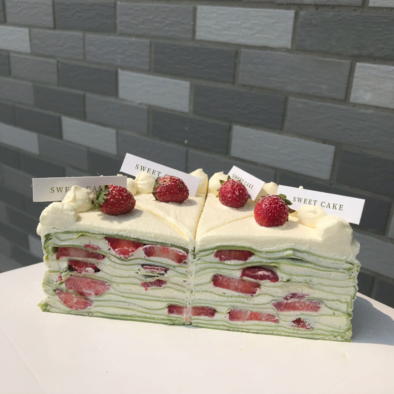 草莓抹茶千层蛋糕,抹茶千层皮 奶油(含草莓果肉)叠层,表层草莓装饰。